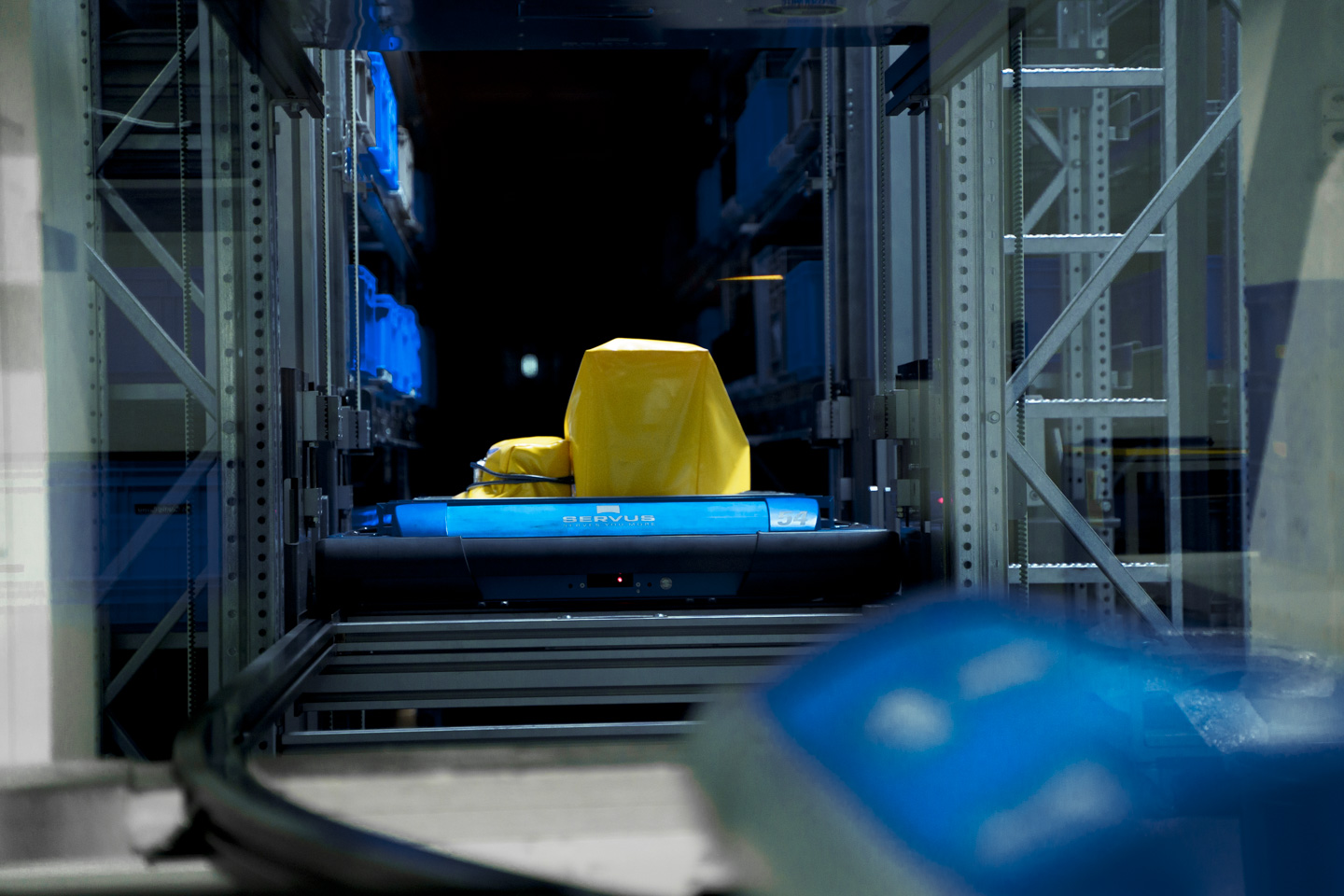 The system includes a small parts warehouse with 27,000 storage locations, 65 transport robots, and a seven-kilometre rail network. It temporarily stores raw materials, semi-finished goods, and sales items. Each production department can store or retrieve materials directly within its area.